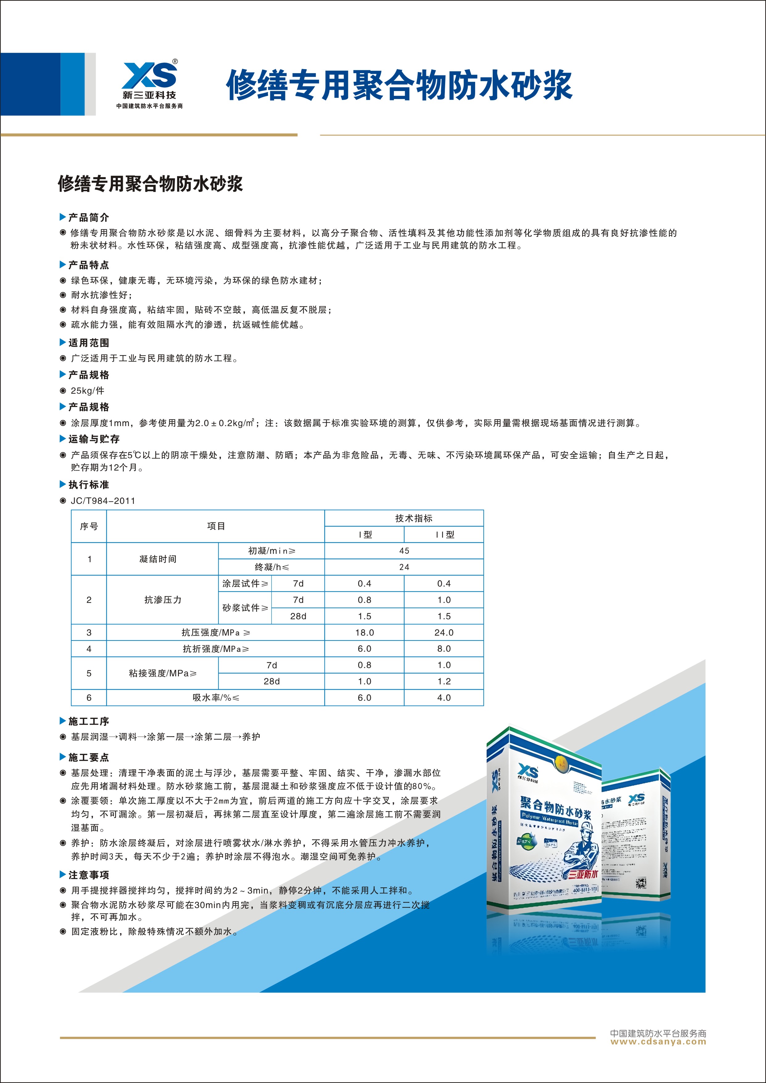 產(chǎn)品簡介: 聚合物水泥防水砂漿是是以水泥、細(xì)骨料為主要材料,以高分子聚合物、活性填料及其他功能性添加劑等化學(xué)物質(zhì)組成的具有良好抗?jié)B性能的粉未狀材料。水性環(huán)保,粘接強度高、成型強度高,抗?jié)B性能優(yōu)越,廣泛適用于工業(yè)與民用建筑的防水工程。 規(guī)格:25kg/袋 | ![]() | ![]() |